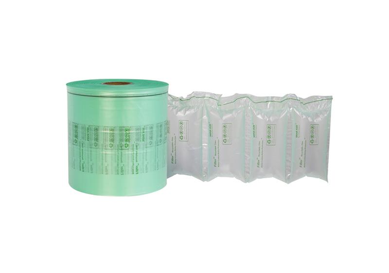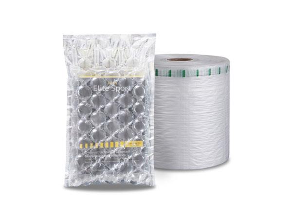BioAir 全生物降解氣泡枕(Filler)BioAir (Compostable Air Pillow)是由全生物降解材料(PBAT)通過吹膜設備和制袋設備制成的氣囊狀薄膜產品。使用時經過充氣設備充氣熱封后,用于包裝容器內產品的填充、減震、穩固產品,可有效吸收貨物運輸過程中因晃動、震動、碰撞、拋丟所帶來的沖擊力,起到緩沖保護的作用,確保產品運輸安全。同時在自然環境中分裂降解為二氧化碳和水,一款環保可降解的緩沖保護包裝材料。